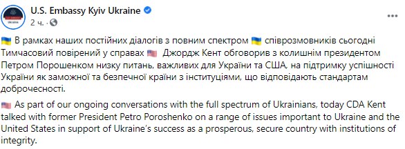 "Кент обсудил с бывшим президентом Петром Порошенко ряд вопросов, важных для Украины и США, в поддержку успешности Украины как процветающей и безопасной страны с институтами, которые отвечают стандартам добродетели", - говорится в сообщении.