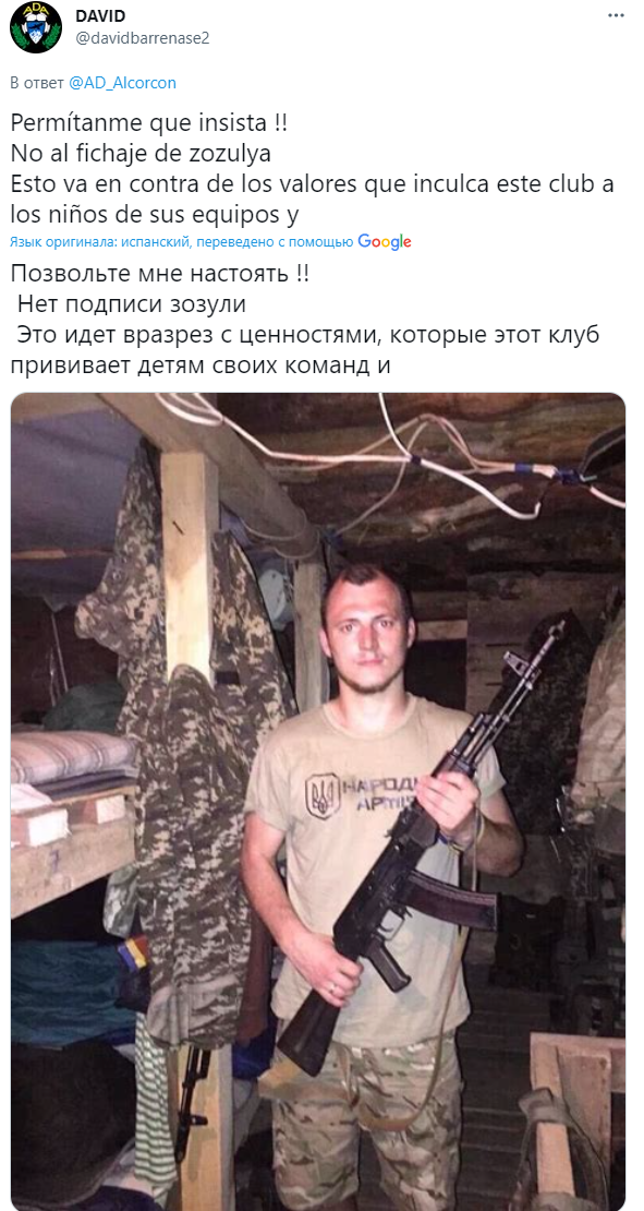Мы считаем, что будет ошибкой для "Алькоркона" подписание трансфера с игроком, который опубликовал фотографии с нацистской символикой и поддерживал ультрас и фашистские формирования в своей стране, несовместимые с ценностями терпимости и уважения, которые способствуют развитию спорта", – цитирует фанатов "Алькоркона" издание AS.
