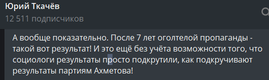 "Вообще показательно. После 7 лет оголтелой пропаганды – такой вот результат! И это еще без учета возможности того, что социологи результаты просто подкрутили", – анализирует журналист Юрий Ткачев.
