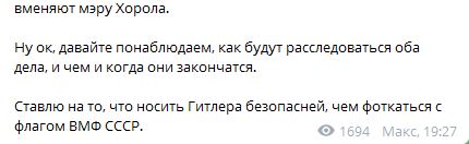 Мнение об этом случае высказал в Telegram нардеп "Слуги народа" Макс Бужанский. Он написал, что Закон о запрете пропаганды тоталитарных режимов выписан таким образом, что если бы мэр Хорола сфотографировался с флагом флота Третьего Рейха, ему бы за это ничего не было.