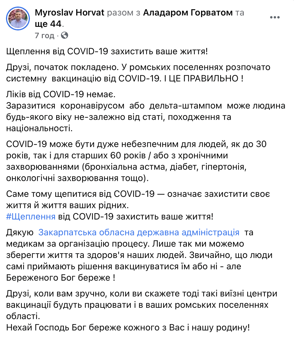 "Друзья, начало положено. В ромских поселениях начата системная вакцинация от Covid-19. И это правильно!" - написал депутат.