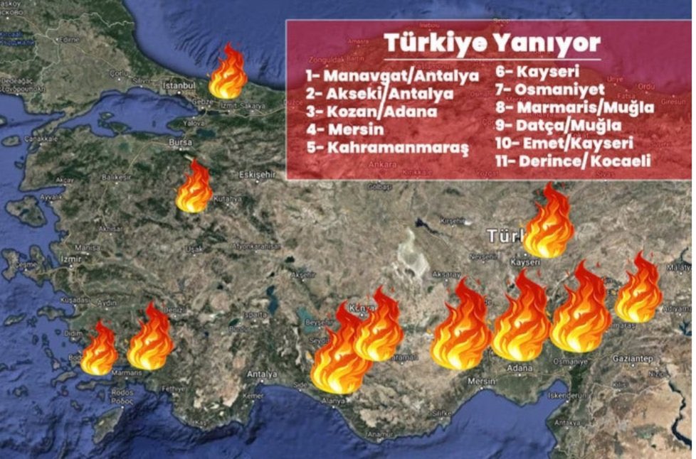 И крупные пожары начались в сотнях километрах от Антальи - вблизи Аланьи и Бодрума, Адана, Мерсина.