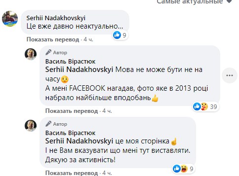 При этом один из комментаторов под фотографией написал, что "тема давно не актуальна". На что Вирастюк потребовал "не указывать ему, что писать" и что "языковой вопрос не может быть не актуальным".