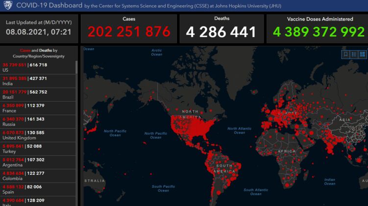 А по последним данным университета Джона Хопкинса (на утро 8 августа 2021 года - Ред.), с момента начала пандемии на Земле коронавирусом заразились уже 202 251 876 человек, умерли на этот час 4 286 441 заболевший (смотри фото).