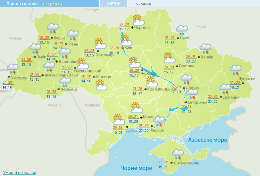 Завтра на юго-востоке Украины ожидаются кратковременные дожди, грозы, днем в отдельных районах град и шквалы 15-20 м/с. На остальной территории без осадков, только днем в западных регионах, а также в Сумской и Харьковской областях местами кратковременный дождь, гроза.