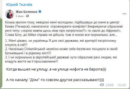 Но вот сегодня победитель Олимпиады Беленюк написал пост, что его на улице оскорбляли за цвет кожи и намекали, что он не достаточно украинец, несмотря на то, что он родился и вырос здесь. И пофиг на его медаль и гопак с флагом.
