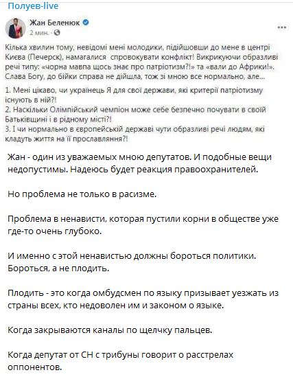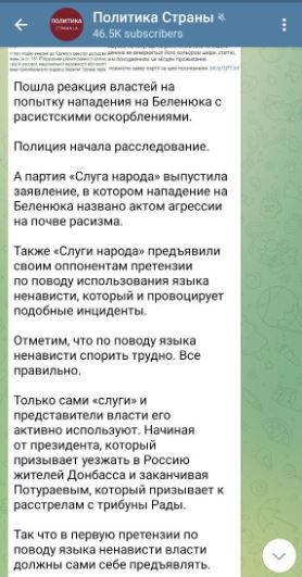 "Пошда реакция властей на попытку нападения на Беленюка с расистскими оскорблениями. Полиция начала расследование. А партия "Слуги народа" выпустила заявление, в котором нападение на Беленюка названо актом агрессии на почве расизма.