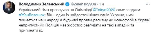 "Украинский гимн прозвучал на Олимпиаде именно благодаря Жану Беленюку! Он - один из самых достойных сынов Украины, им гордится наш народ! А любые проявления расизма или ксенофобии в Украине недопустимы! Полиция будет жестко реагировать на такие случаи и пресекать их" - написал президент.