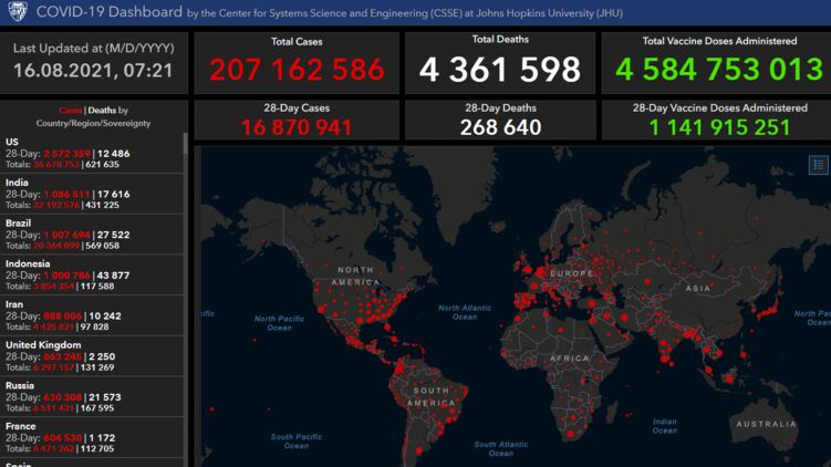 По данным на 16 августа, число зараженных на Земле перевалило за 207 миллионов, фото: университет Дж. Хопкинса