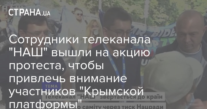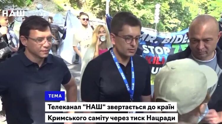 Сотрудники телеканала "НАШ" вышли на акцию протеста с целью привлечь внимание участников международного саммита "Крымская платформа", к попыткам власти закрыть их телеканал.
