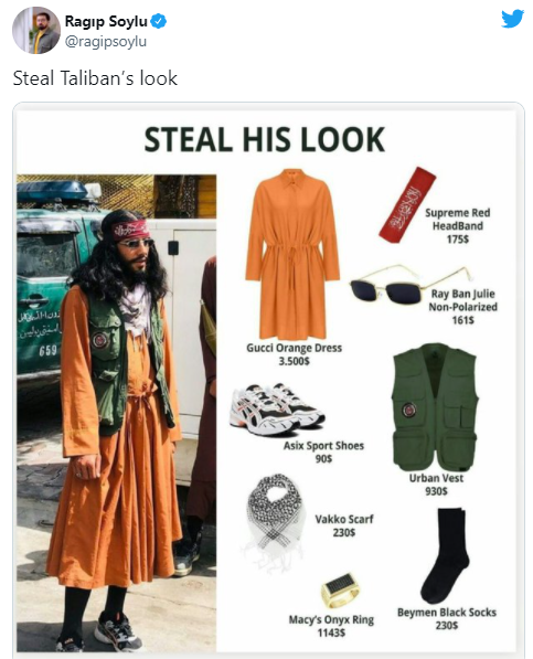 В то же время, турецкий журналист Рагип Сойлу в своем Twitter предложил воссоздать образ талиба с помощью платья Gucci, повязки Supreme, жилета Urban Vest и других аксессуаров. По его подсчетам, цена такого наряда составляет 6,5 тыс. долларов. Его пост собрал более 20 тысяч лайков.
