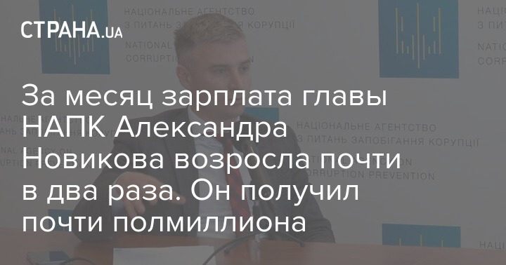За месяц зарплата главы НАПК Александра Новикова возросла почти в два раза. Он получил почти полмиллиона