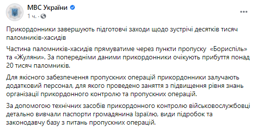 "Часть паломников-хасидов будет следовать через пункты пропуска "Борисполь" и "Жуляны". По предварительным данным пограничники ожидают прибытия более 20 000 паломников", - говорится в сообщении.