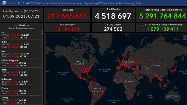 Число зараженных коронавирусом в мире приближается к 218 миллионам, фото: arcgis.com
