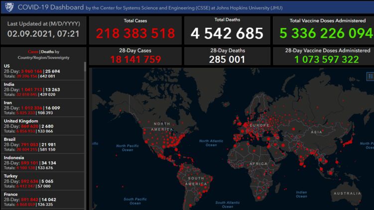 По данным университета Джона Хопкинса на 08:00 утра 2 сентября в мире коронавирус выявили уже у 218 383 518 человек. Умерло с начала пандемии 4 542 685заболевших.