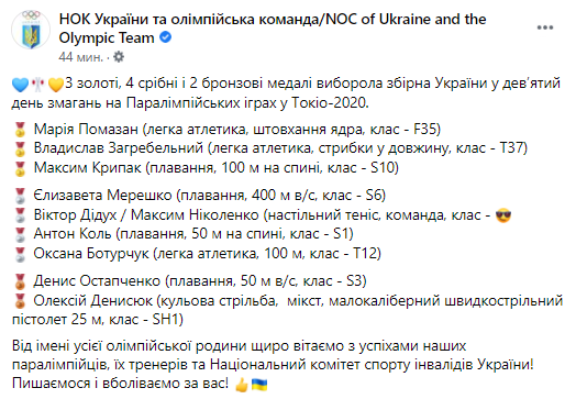 Девятый день Паралимпиады-2020 в Токио принес украинской сборной девять наград, среди которых три золотые, четыре серебряные и две бронзовые. Об этом сообщает Национальный олимпийский комитет Украины.