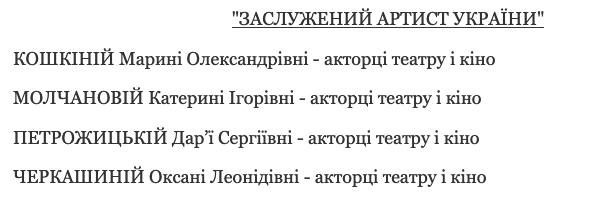 В субботу, 11 сентября, на сайте президента Украины появился указ, в котором говорится о награждении актрисы театра и кино Дарьи Петрожицкой званием Заслуженный артист Украины.