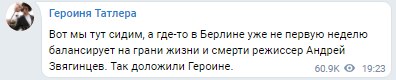 Например, в Телеграм-канале "Героиня Татлера" заявляют, что "в Берлине уже не первую неделю балансирует на грани жизни и смерти режиссер Андрей Звягинцев" с последствиями COVID-19.
