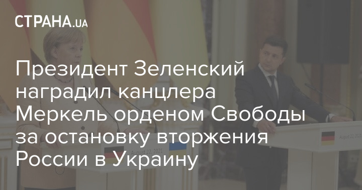 Владимир Зеленский наградил канцлера Германии Ангелу Меркель орденом Свободы за особые усилия в рамках поддержки суверенитета Украины, благодаря которым удалось остановить вторжение России на территорию нашей страны.