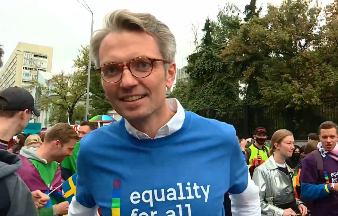 11:12 На "Марш равенства" пришел посол Швеции Тобиас Тиберг. Он отказался отвечать журналисту "Радио Свобода" по-украински и попросил говорить на английском.
