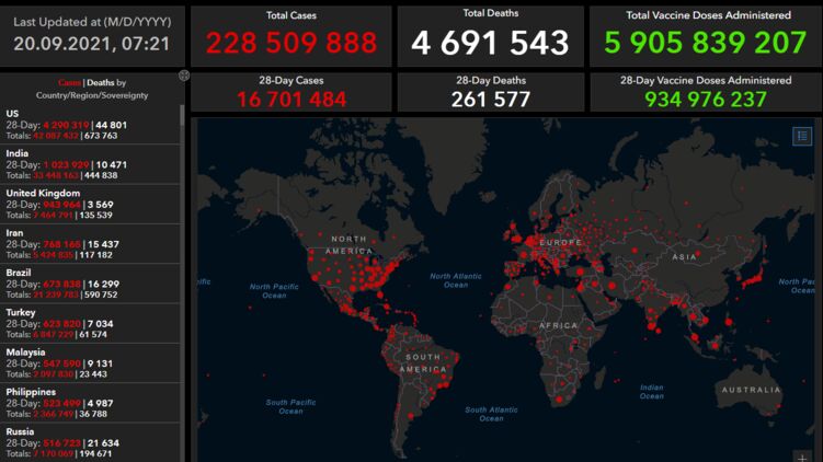 В целом на планете, по данным университета Джона Хопкинса на утро 20 сентября, число зараженных достигло отметки в 228 509 888 человек.