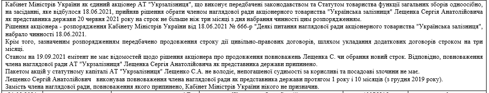 Однако, состоянием на 19.09.2021 эмитент не располагает сведениями о решении акционера о продлении полномочий Лещенко или избрания на  новый срок.