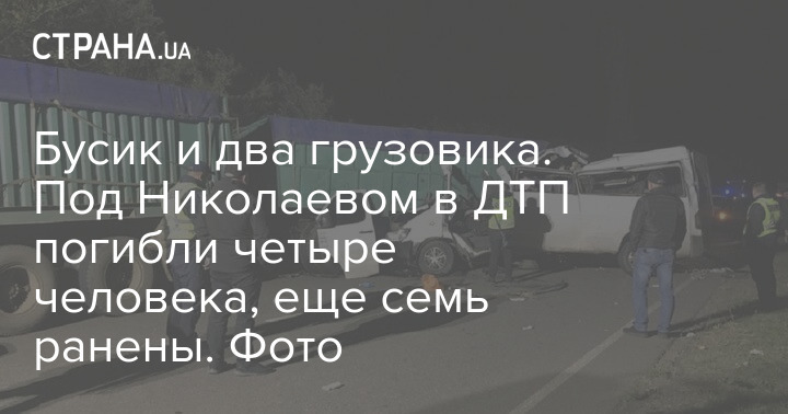 Вчера, 27 сентября, в Николаевской области произошла еще одна автомобильная трагедия. Здесь, на автотрассе Снегиревка - Калиновка (в районе села Широкое - Ред.) столкнулись микроавтобус и два тяжелых грузовика. В результате ДТП 4 человека погибли и 7 получили тяжелые травмы.
