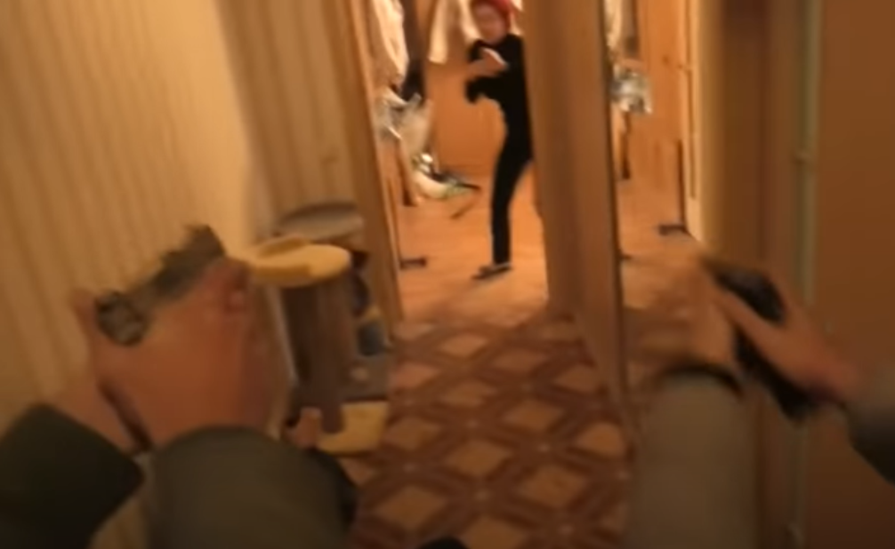 Далее они начинают вырезать замок болгаркой. В этот момент видео показывает ситуацию изнутри квартиры: спиной к камере стоит Зельцер с винтовкой в руках.
