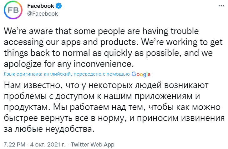 "Нам известно, что у некоторых людей возникают проблемы с доступом к нашим приложениям и продуктам. Мы работаем над тем, чтобы как можно быстрее вернуть все в норму, и приносим извинения за любые неудобства", - написала соцсеть.
