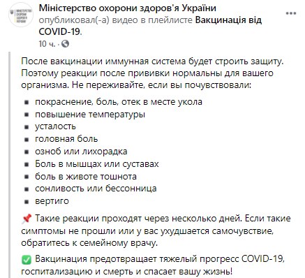 В МОЗ назвали украинцам главные побочные эффекты вакцинации от коронавируса