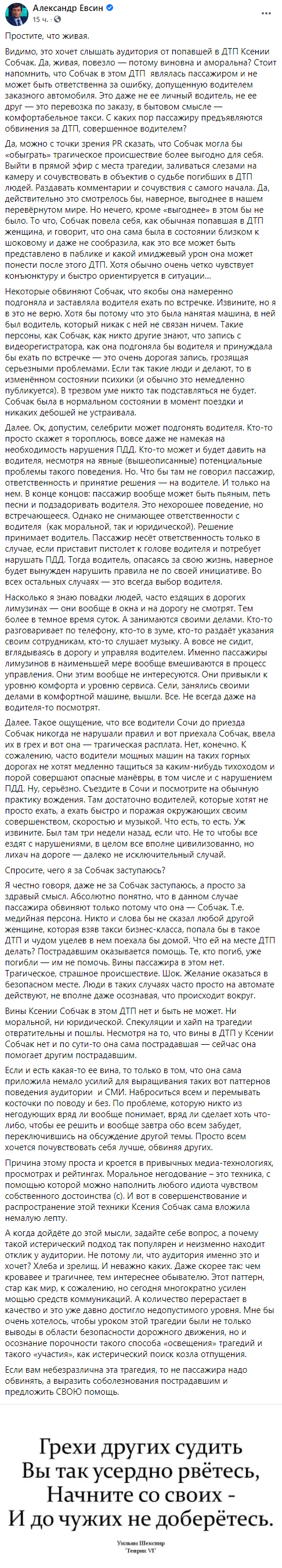 То, что Собчак повела себя, как обычная попавшая в ДТП женщина, и говорит, что она сама была в состоянии близком к шоковому и даже не сообразила, как это все может быть представлено в паблике и какой имиджевый урон она может понести после этого ДТП", - написал Евсин.