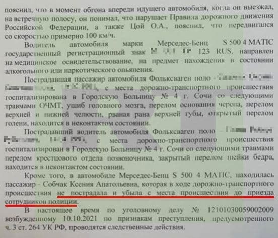 Сама телеведущая, ее спутники и водитель серьезных травм не получили. Собчак покинула место происшествия до прибытия полиции. Об этом свидетельствует справка о данном ДТП, которая оказалась в распоряжении RT.