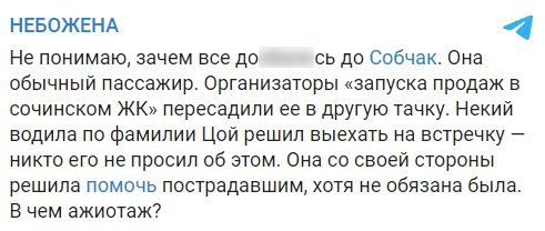 "Она обычный пассажир. Организаторы "запуска продаж в сочинском ЖК" пересадили ее в другую тачку. Некий водила по фамилии Цой решил выехать на встречку - никто его не просил об этом. Она со своей стороны решила помочь пострадавшим, хотя не обязана была. В чем ажиотаж?"