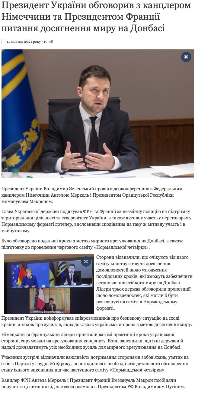 Сегодня вечером, 11 октября, с разницей ровно в один час на сайтах президентов Украины и России появились отчеты о телефонных переговорах. Владимир Зеленский первым, Владимир Путин вторым побеседовали с коллегами из Франции и Германии - Ангелой Меркель и Эммануэлем Макроном.