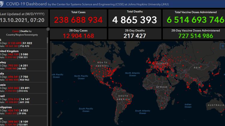 Университет Джона Хопкинса также привел новую и печальную статистику на утро 13 октября. С начала пандемии на планете уже 238 688 934 человек заразились СOVID-19. Умерли с начала пандемии - 4 865 393 человека.
