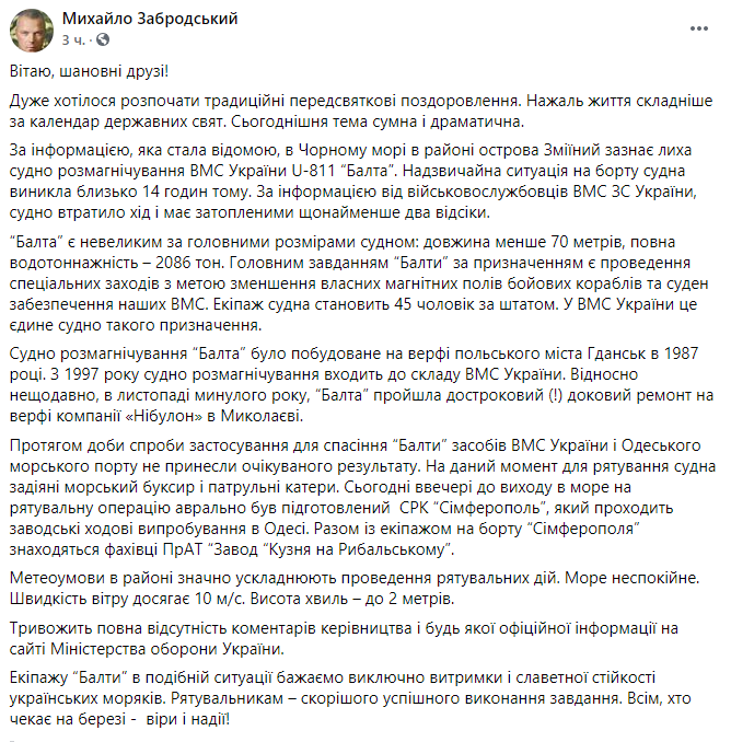 Народный депутат Михаил Забродский сообщил у себя в Facebook, что около острова Змеиный терпит бедствие корабль Военно-морского флота Украины "Балта".