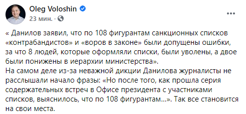 "Данилов заявил, что по 108 фигурантам санкционных списков "контрабандистов" и "воров в законе" были допущены ошибки, за что 8 людей, которые оформляли списки, были уволены, а двое были понижены в иерархии министерства".