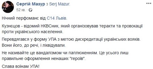 Координатор С14 Сергей Мазур опубликовал на своей странице в Facebook циничное послание с просьбой "не называть ночной перфоманс актом вандализма".