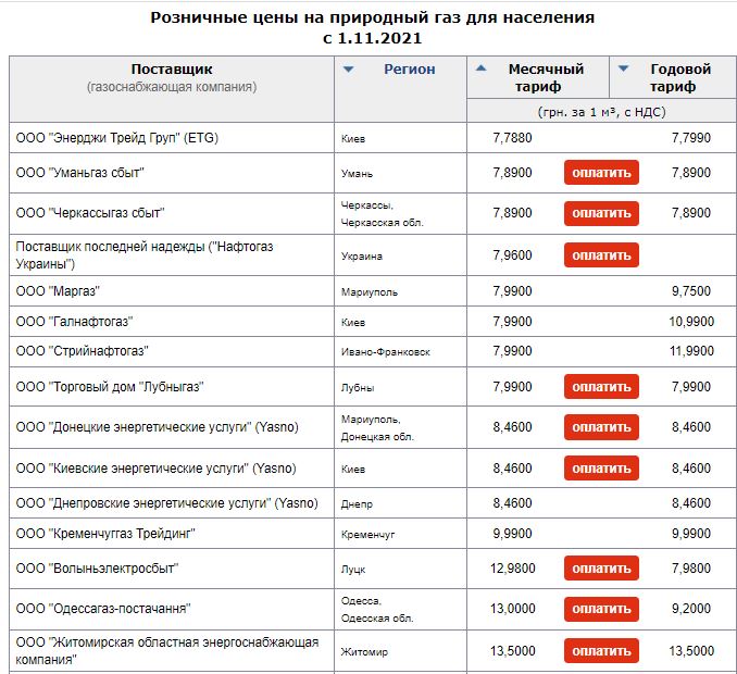 Месячный тариф на газ в ноябре у разных поставщиков колеблется от 7,7-7,8 грн до 38-38,3 грн за куб.