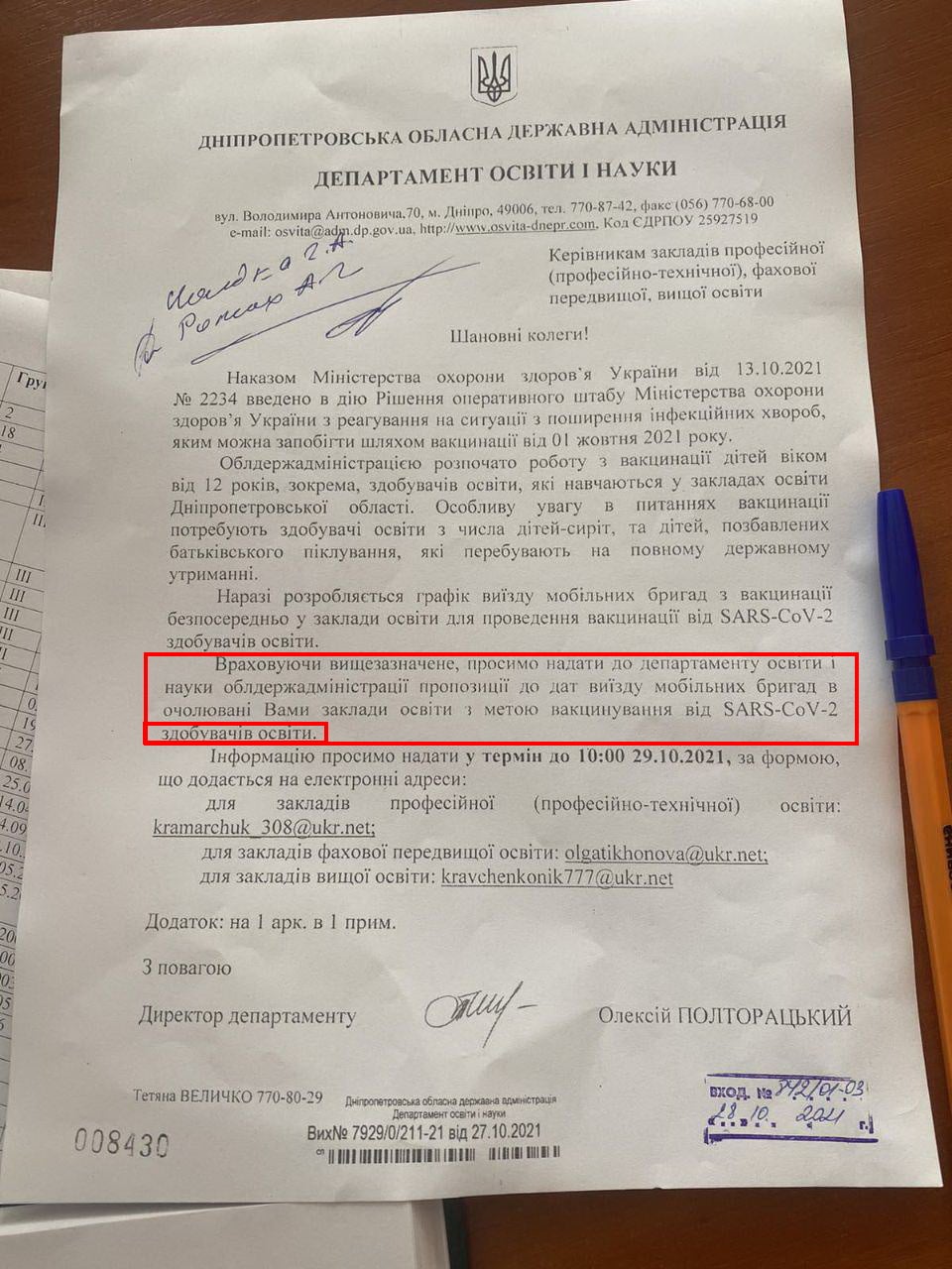 В Днепропетровской области 28 октября руководителей профтехучилищ, колледжей и вузов уведомили о том, что собираются запустить массовую вакцинацию от ковида детей от 12 лет с выездом медбригад в учебные заведения. Об этом говорится письме Департамента образования и науки. Судя из текста, в первую очередь планируют привить детей-сирот и детей, лишенных родительской опеки, которые находятся на полном государственном обеспечении.