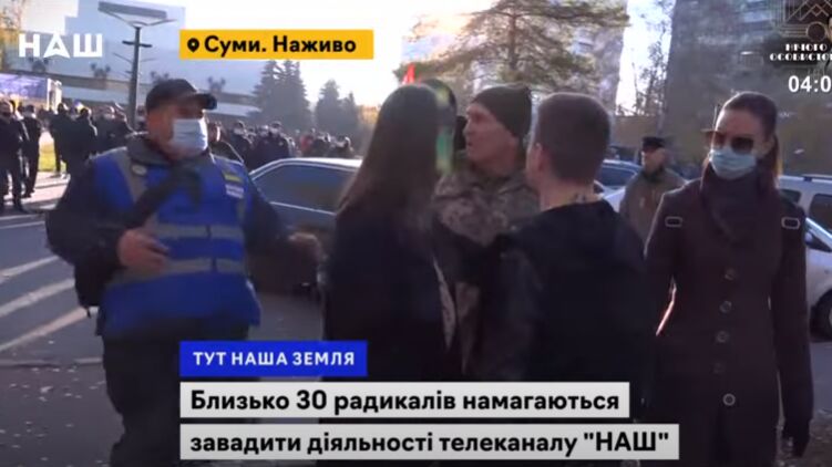 В субботу, 30 октября, во время съёмок спецпроекта "Здесь наша земля" в Сумах на журналистов телеканала "НАШ" напали несколько десятков радикалов. Активисты применяли физическую силу к журналистам и операторам, требуя закончить прямой эфир.
