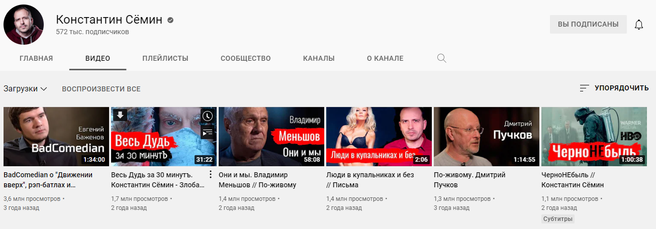 Топовые видео на канале Семина с миллионами просмотров - это интервью с единомышленниками: Баженовым, Пучковым, а также критические обзоры на самые яркие "антисоветские" фильмы: "Чернобыль" от HBO или ту же "Колыму" Дудя.