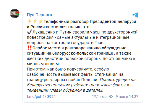 "Происходящие на белорусско-польских рубежах тревожные факты и тенденции Главы государств обсудили в деталях", - говорится в сообщении телеграм-канала, который связывают с пресс-службой Лукашенко.