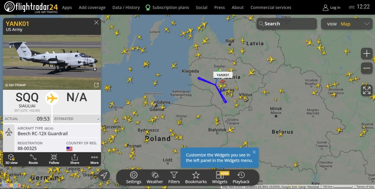 В пятницу, 12 ноября, самолет-разведчик Соединенных Штатов Beechcraft RC-12 проводит полет у границ Беларуси и Калининградской области Российской Федерации.