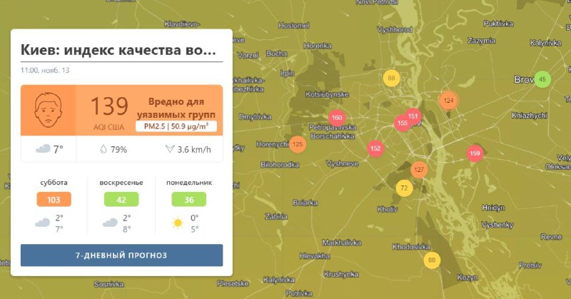 При этом сервисы контроля качества воздуха показывают в Киеве, а особенно - на правом берегу и в районе Бортничей - существенное загрязнение качества воздуха.