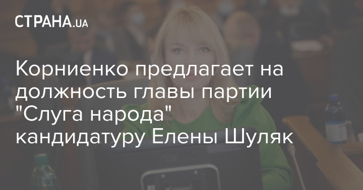 Александра Корниенко, который сложил с себя полномочия главы партии "Слуга народа", как и писала "Страна", предлагает назначить на свое место Елену Шуляк.