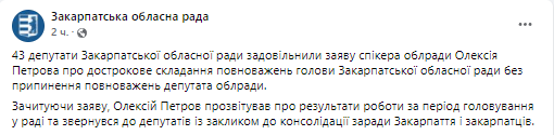 "Депутаты Закарпатского областного совета удовлетворили заявление спикера облсовета Алексея Петрова о досрочном сложении полномочий председателя Закарпатского облсовета без прекращения полномочий депутата облсовета", - указано в сообщении.