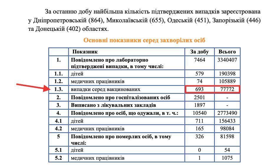 Самый высокий показатель госпитализации вакцинированных хотя бы одной дозой в Сумской области (26,92%). Самый низкий - в Волынской области (4,94%). В Киеве 22,41% госпитализированных больных были вакцинированы хотя бы одной дозой.