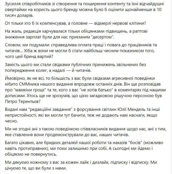 23 ноября на Facebook-странице издания появился пост с заявлением сотрудников. Они сообщили, что покидают проект из-за травли руководства, надуманных обвинений и урезания зарплаты. А также черного пиара, которым занимается издание по политическим мотивам.
