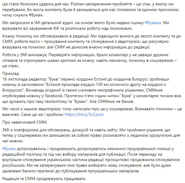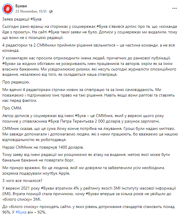 В конце автор поста заявил, что другие журналисты "Букв" тоже опубликуют свои истории о внутренней кухне издания.